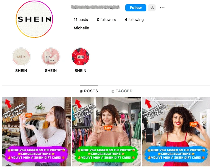 For instance, below is an example of the official Instagram account of SHEIN official and then a fake social media account impersonating the brand.